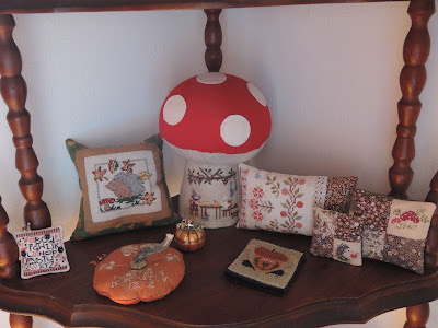 The above picture shows the other pumpkin pincushion I made years ago. I used the same linen, but stuffed this one with crushed walnut shells. It makes for a heavy, flattish pumpkin. I still love it though.